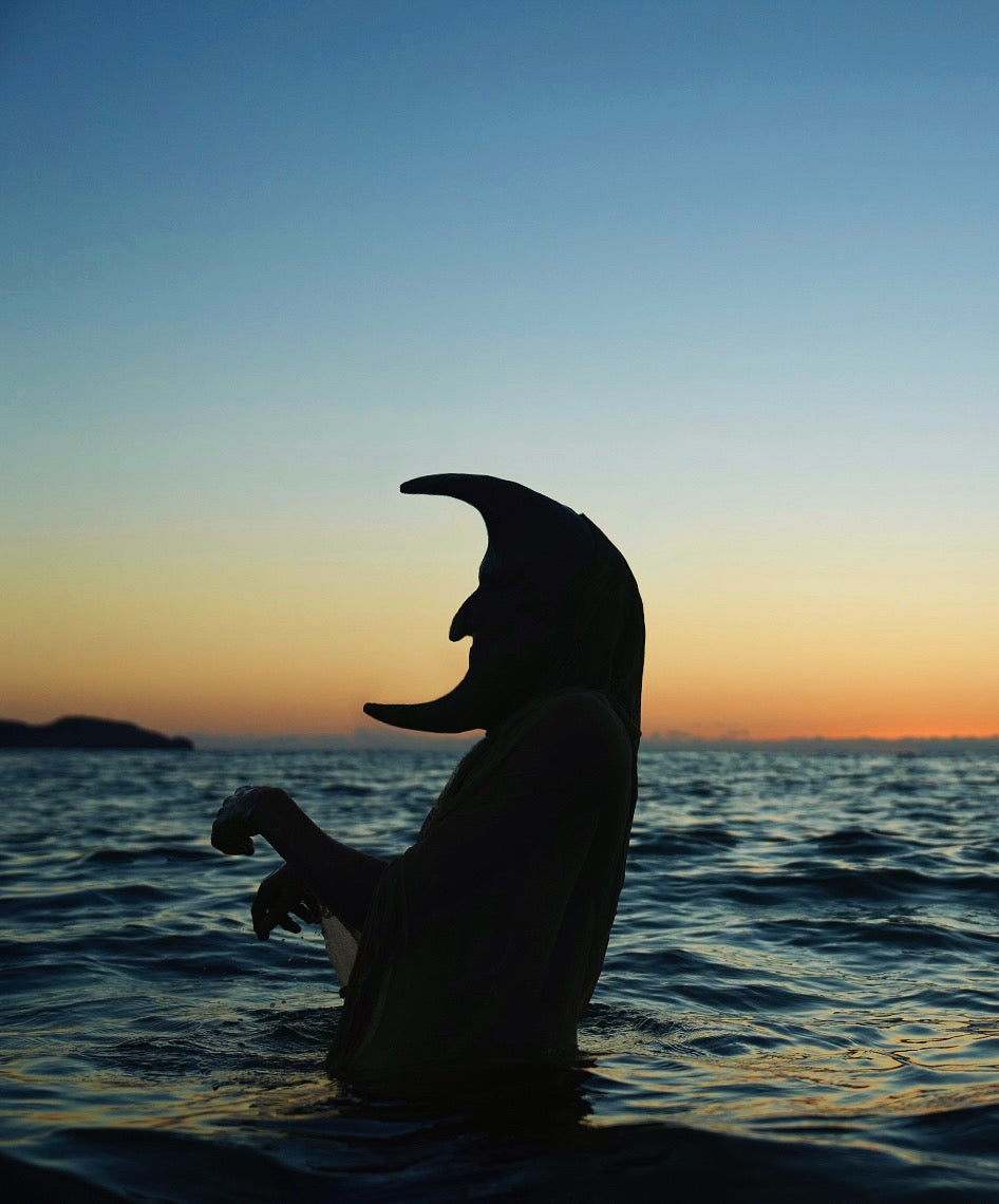 The Greek artist, who has spent much of his adult life moving between the beaches of his home country and the restless energy of cities like Berlin and Athens, invited us to meet him in another part of Goa, as it happened that we were both traveling through India at the same time. It felt like a moment of synchronicity. I had wanted to work with Myrgon ever since I first encountered his work at Waking Life Festival in Portugal in 2024. What I witnessed there felt unlike anything I had seen before. It unfolded more like a ritual than a performance, something existing on the threshold between the visible and the unseen. It felt at once familiar and entirely unknown. I couldn’t tell whether the human behind the clay mask was performing, or whether the persona itself had taken over. For nearly an hour, I sat there, completely mesmerized. By the end, he had drawn the entire crowd from inside the tent into a slow procession toward a gigantic egg structure built on the festival grounds, as if summoned by some unseen force. Nearly two years later, the experience find its continuation on a beach in the north of Goa.
